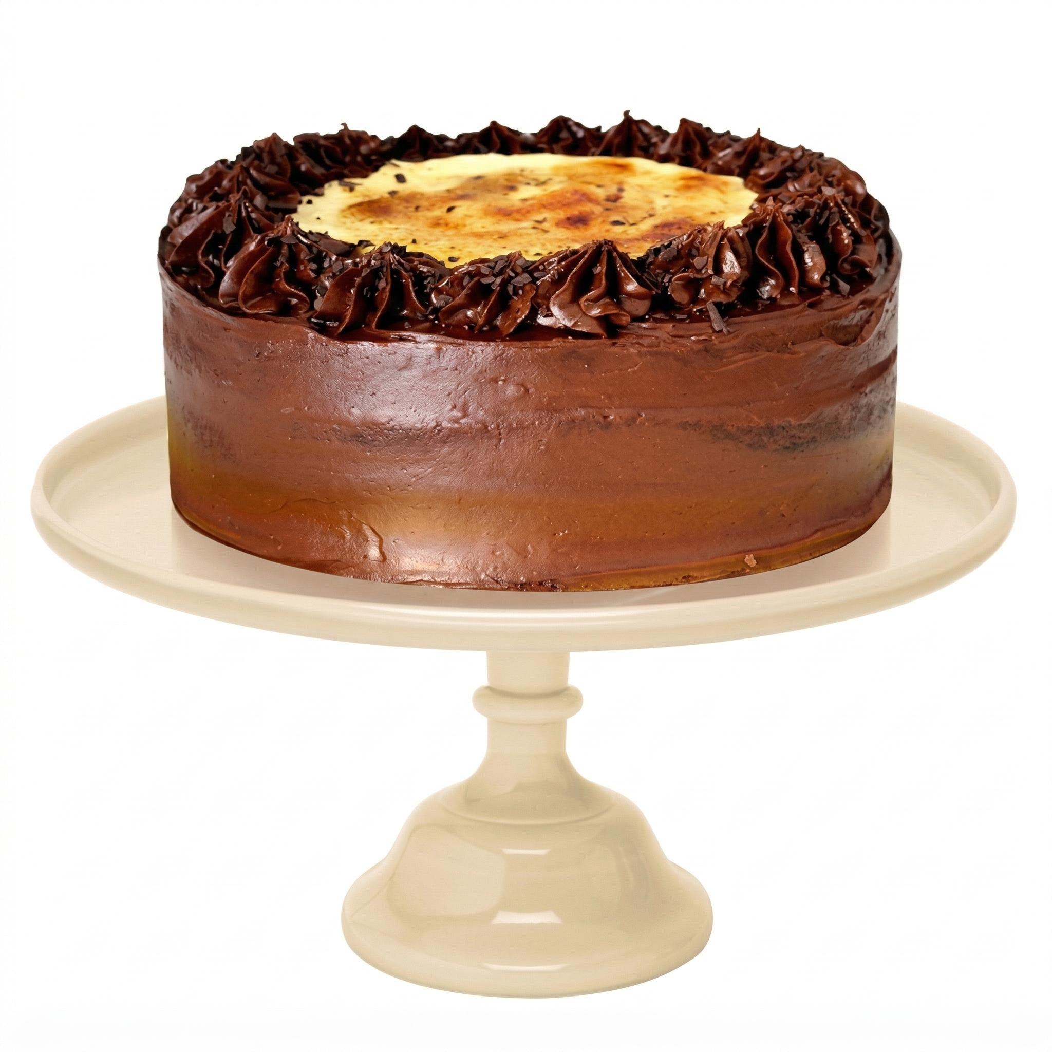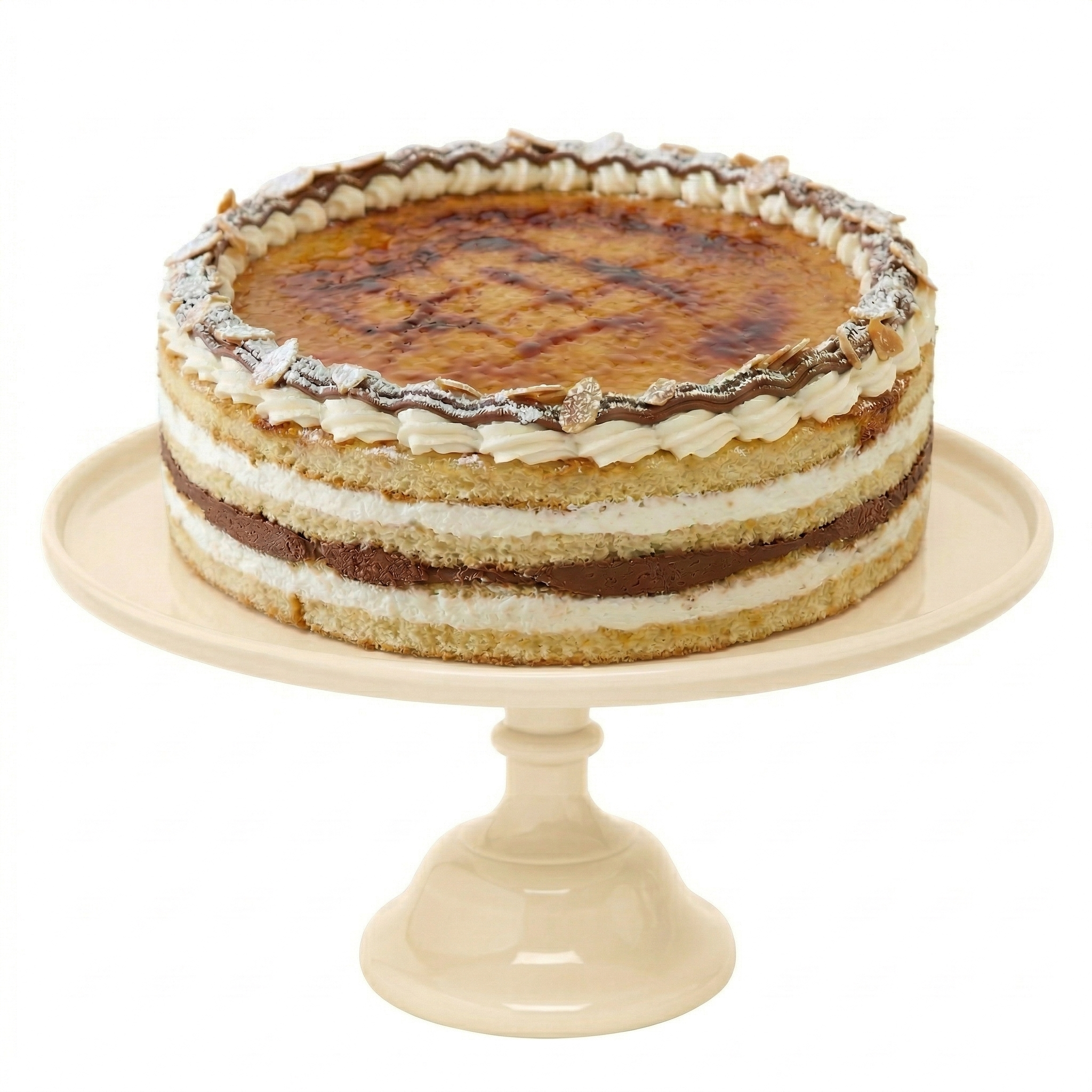 Bizcocho de vainilla y crema pastelera con cobertura de chocolate y crema tostada.