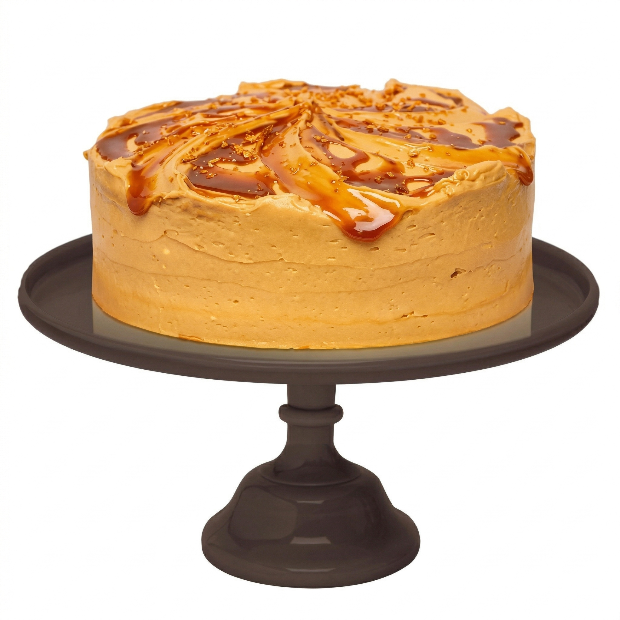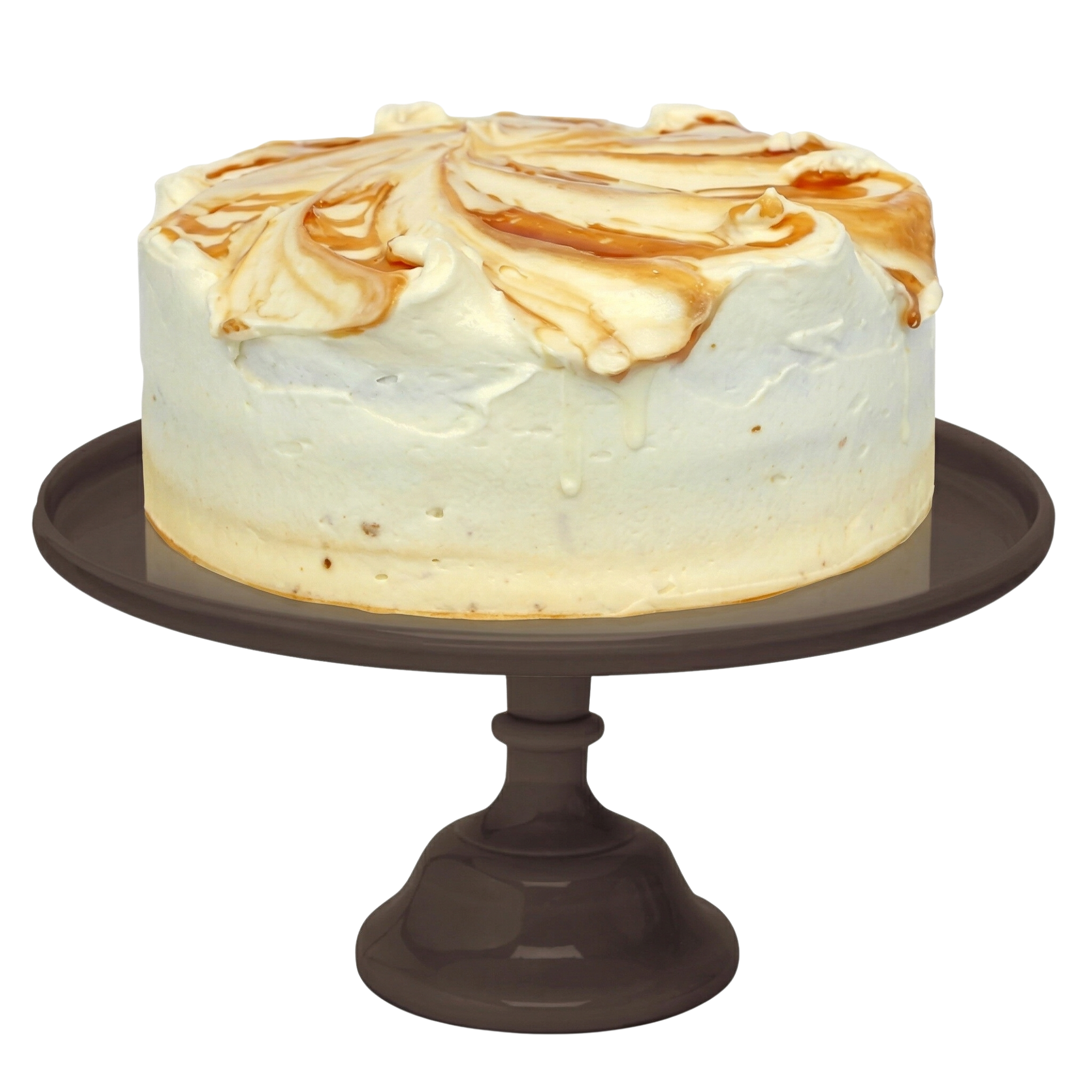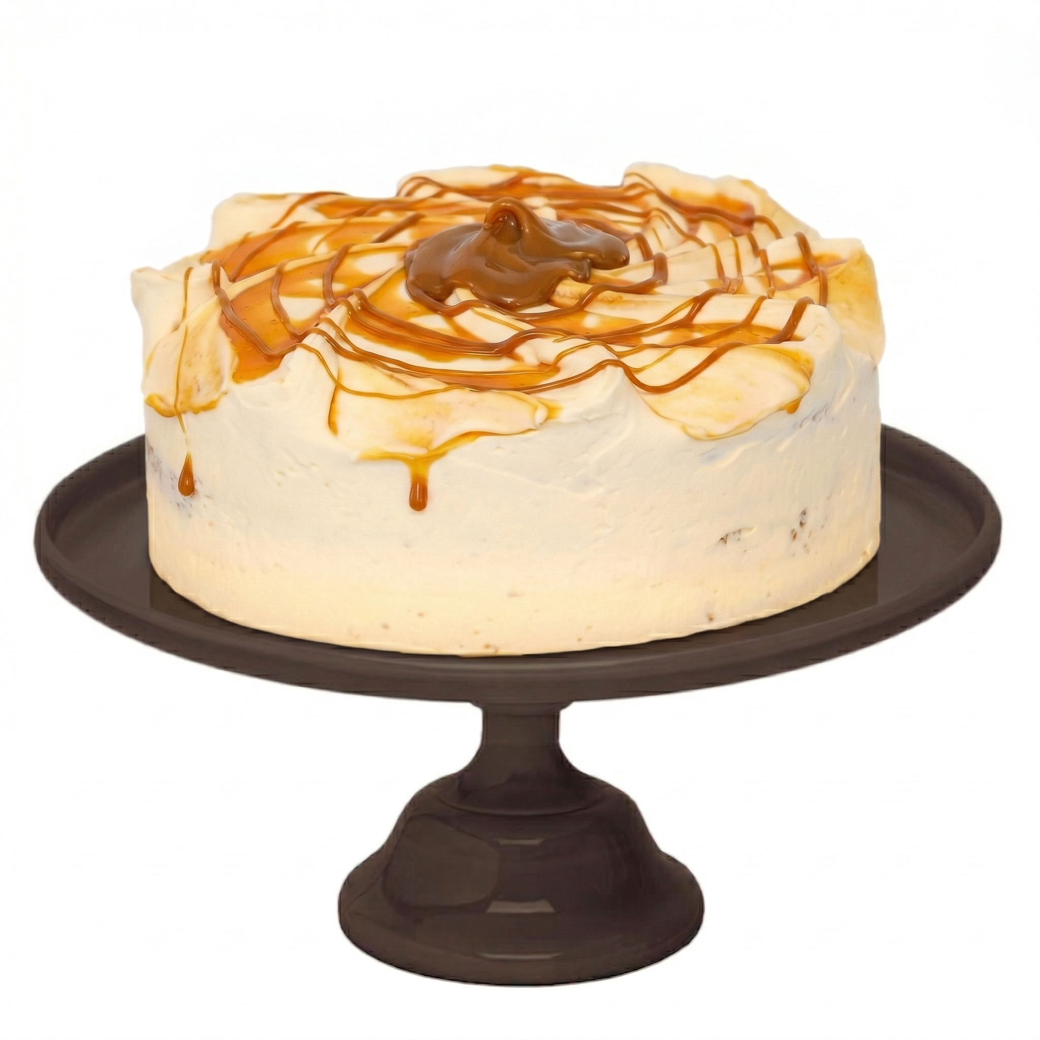Bizcocho de plátano y nueces sin trozos, relleno y recubierto con frosting de caramelo.
