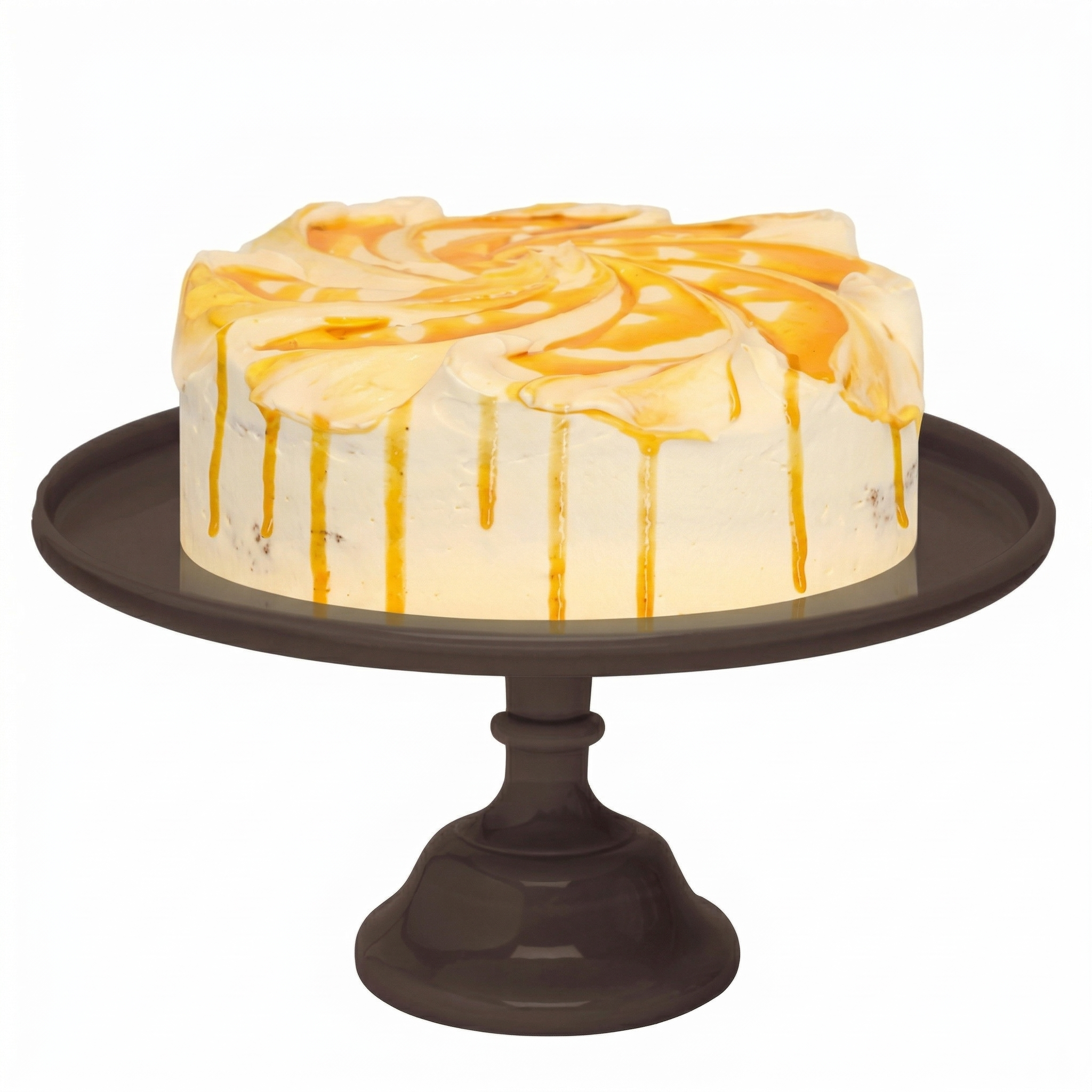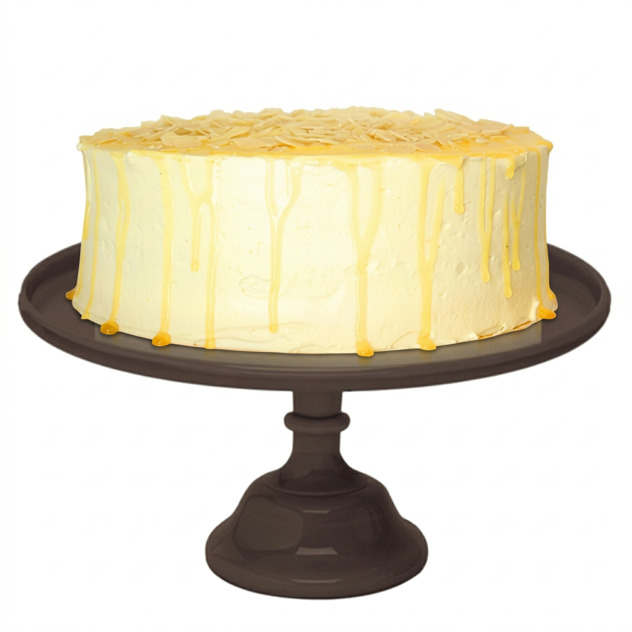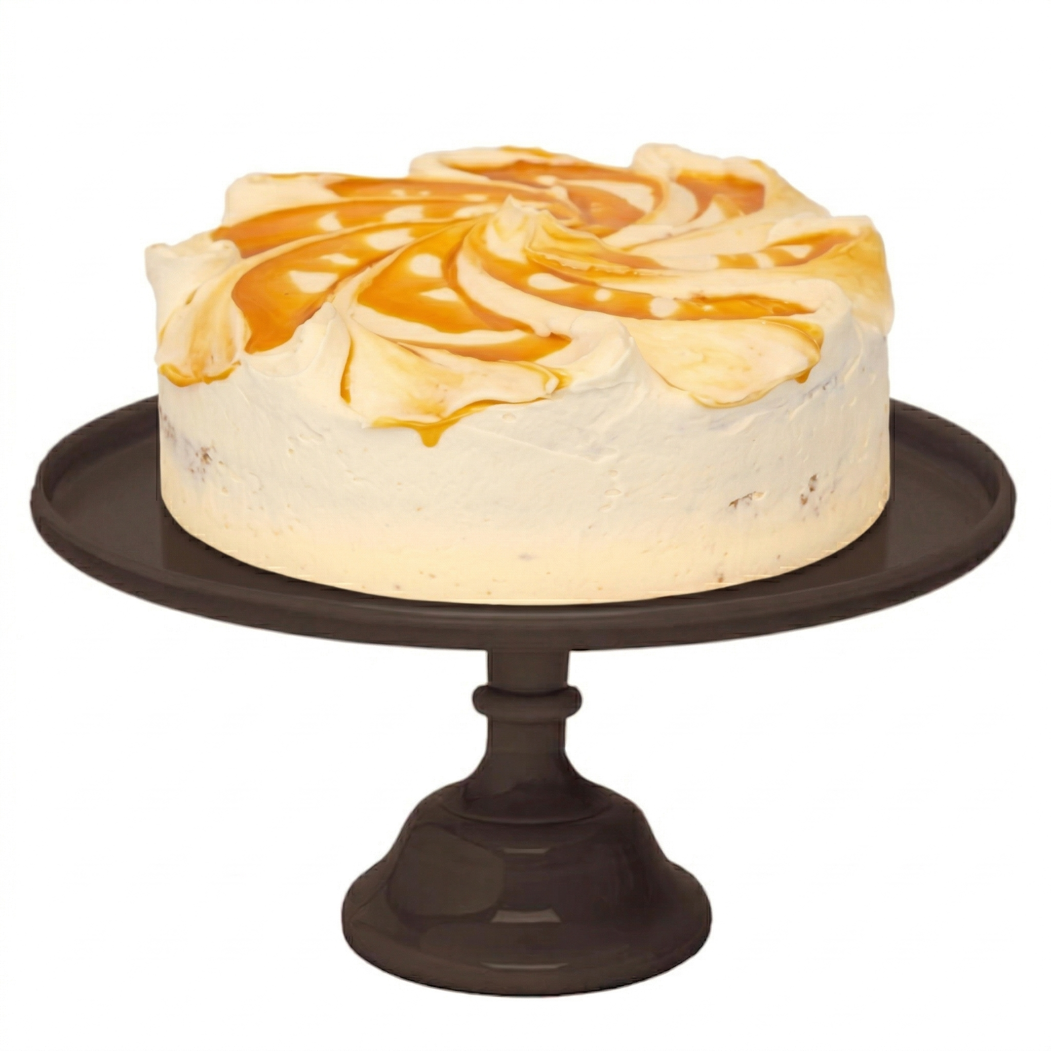 Bizcocho de plátano y nueces sin trozos, relleno y recubierto con frosting de caramelo.
