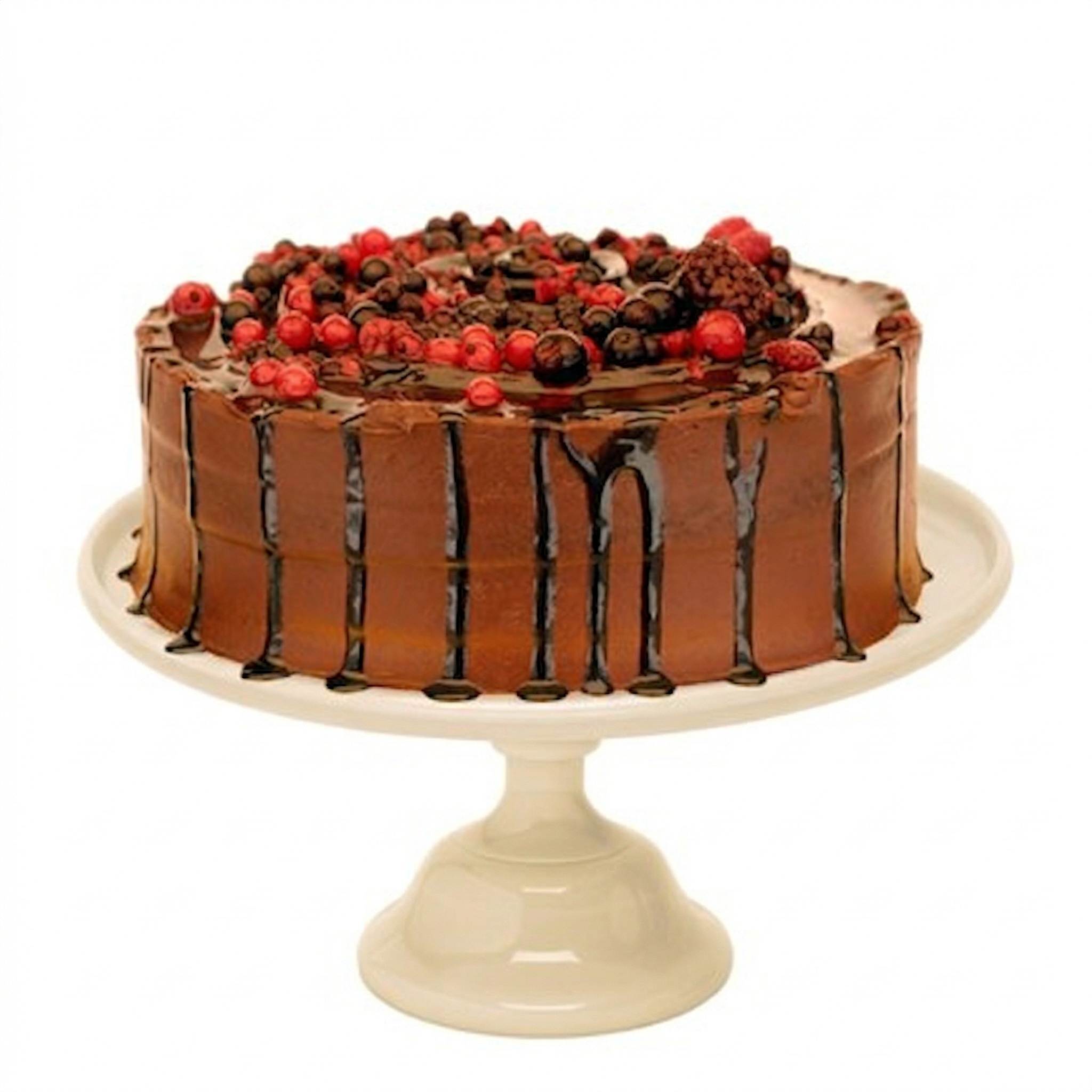 Jugoso bizcocho rojo de cacao y vainilla con ganaché de chocolate y frutos rojos.