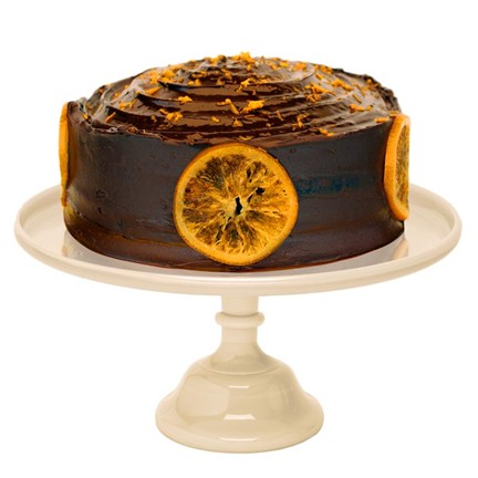 Bizcocho de naranja almibarado con confitura casera y cobertura de chocolate al 62%.