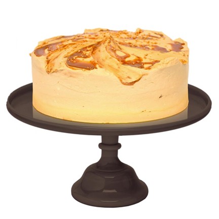 Bizcocho de plátano y nueces sin trozos, relleno y recubierto con frosting de dulce de leche.